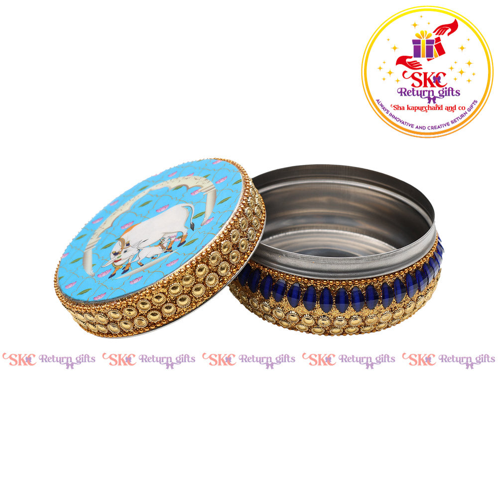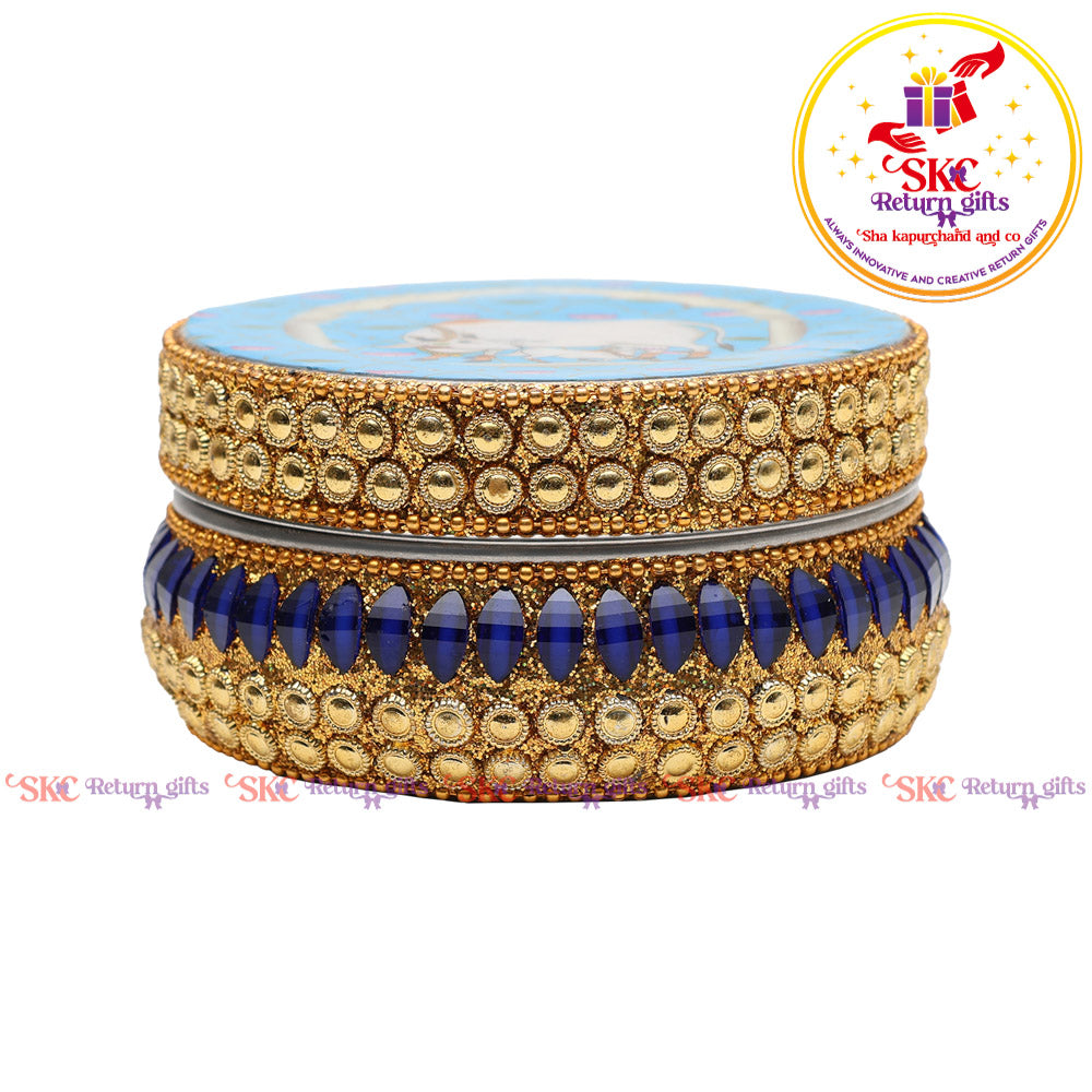 Elevate your return gifts with our exquisite Jaipur Kundan Box, a perfect blend of tradition and luxury. Adorned with intricate Kundan work, this elegant box is ideal for storing jewelry or cherished keepsakes, making it a timeless token of appreciation.