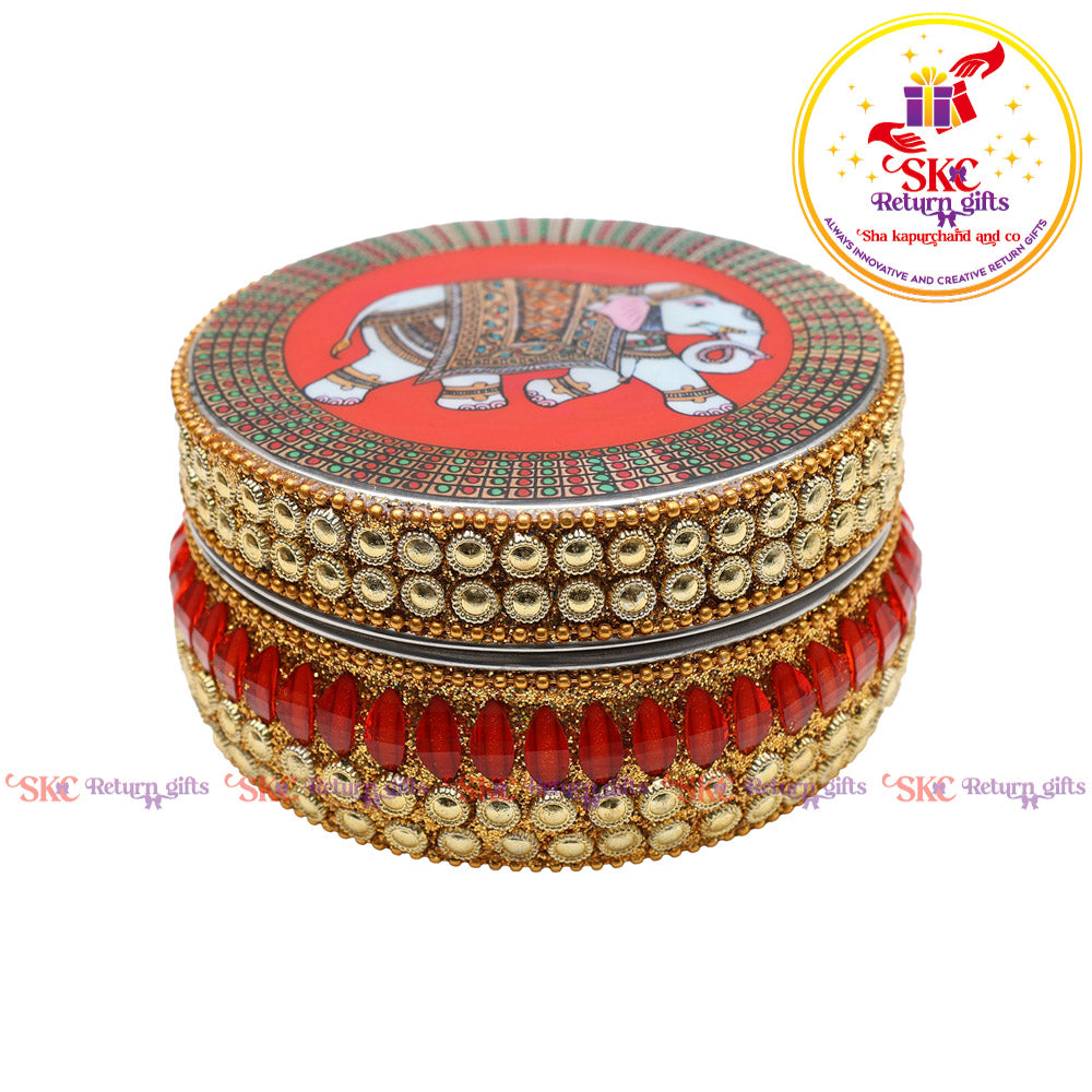 Elevate your return gifts with our exquisite Jaipur Kundan Box, a perfect blend of tradition and luxury. Adorned with intricate Kundan work, this elegant box is ideal for storing jewelry or cherished keepsakes, making it a timeless token of appreciation.
