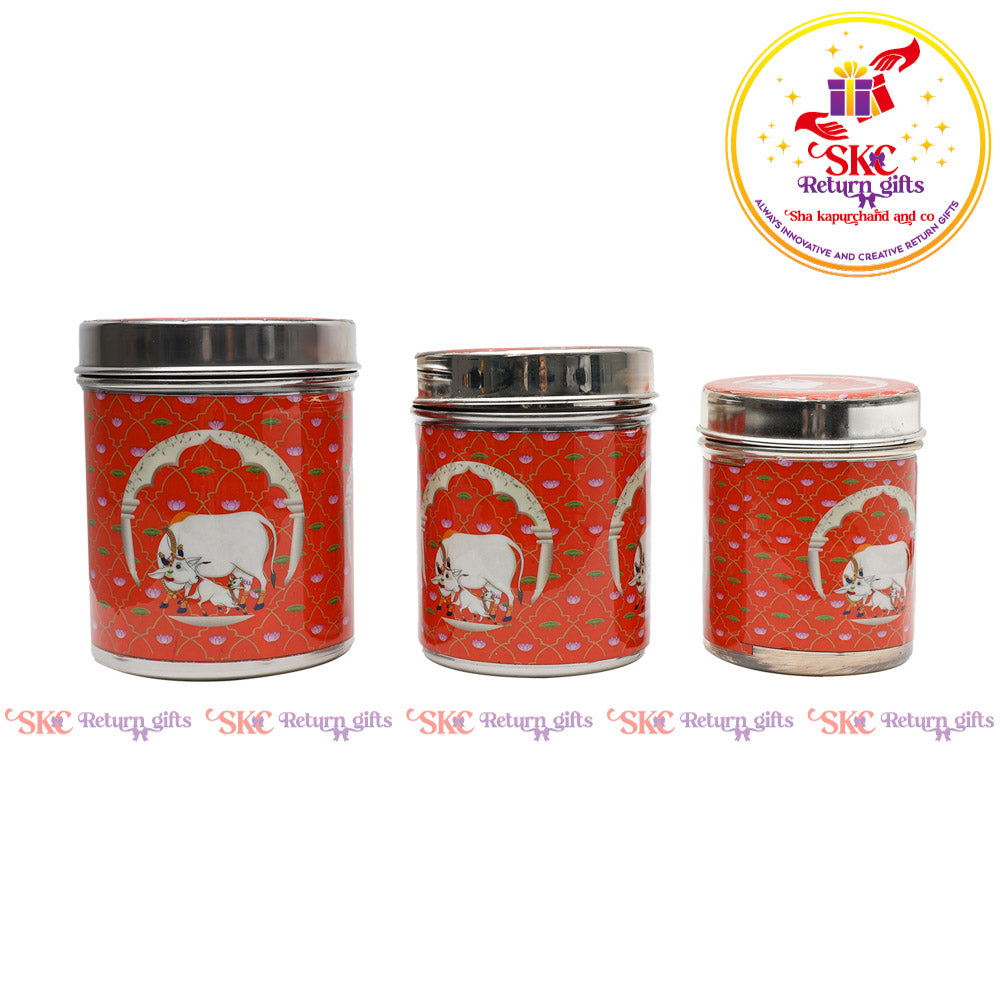 Our beautifully crafted gift jars sets are the perfect return gift for any occasion, offering both elegance and functionality. Designed with intricate patterns and divine motifs, these jars are ideal for serving sweets, dry fruits, or for use during pooja rituals. these sets add a touch of tradition and luxury to your guests' homes. A meaningful and practical gift that will be cherished for years, our gift jars sets are sure to leave a lasting impression.