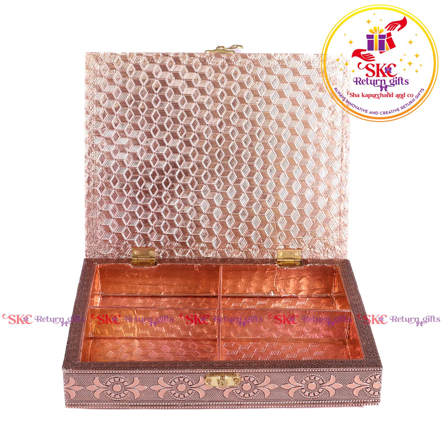 Elevate your return gifts with our exquisite collection of pooja and jewel boxes, designed to be both functional and enchanting. Crafted with intricate detailing and inspired by traditional artistry, these boxes are perfect for storing. Pooja items i, jewelry, or cherished treasures. A blend of cultural heritage and modern elegance, . Delight your guests with a gift that symbolizes both utility and timeless beauty.