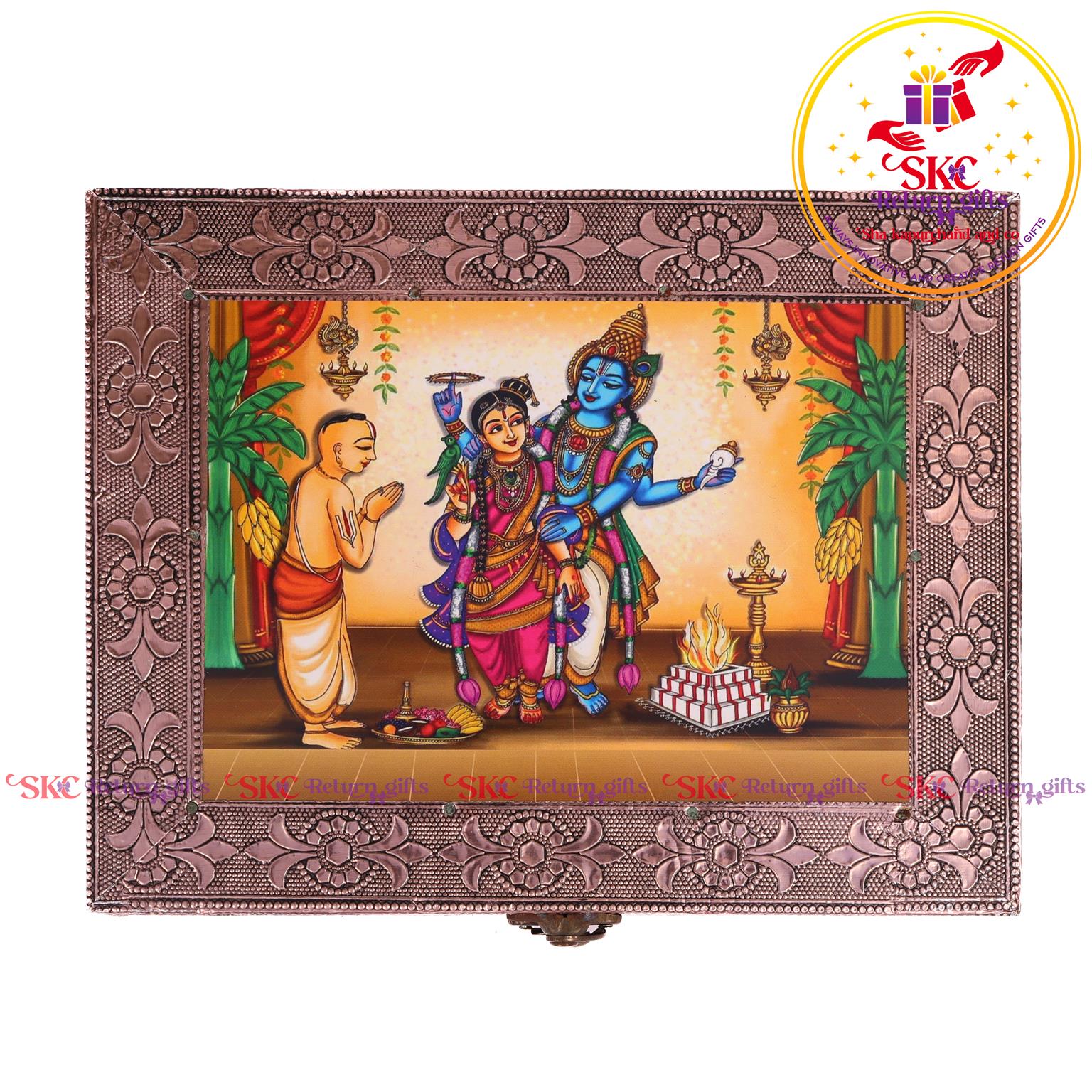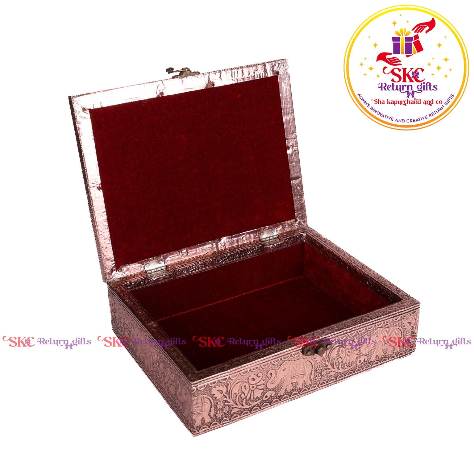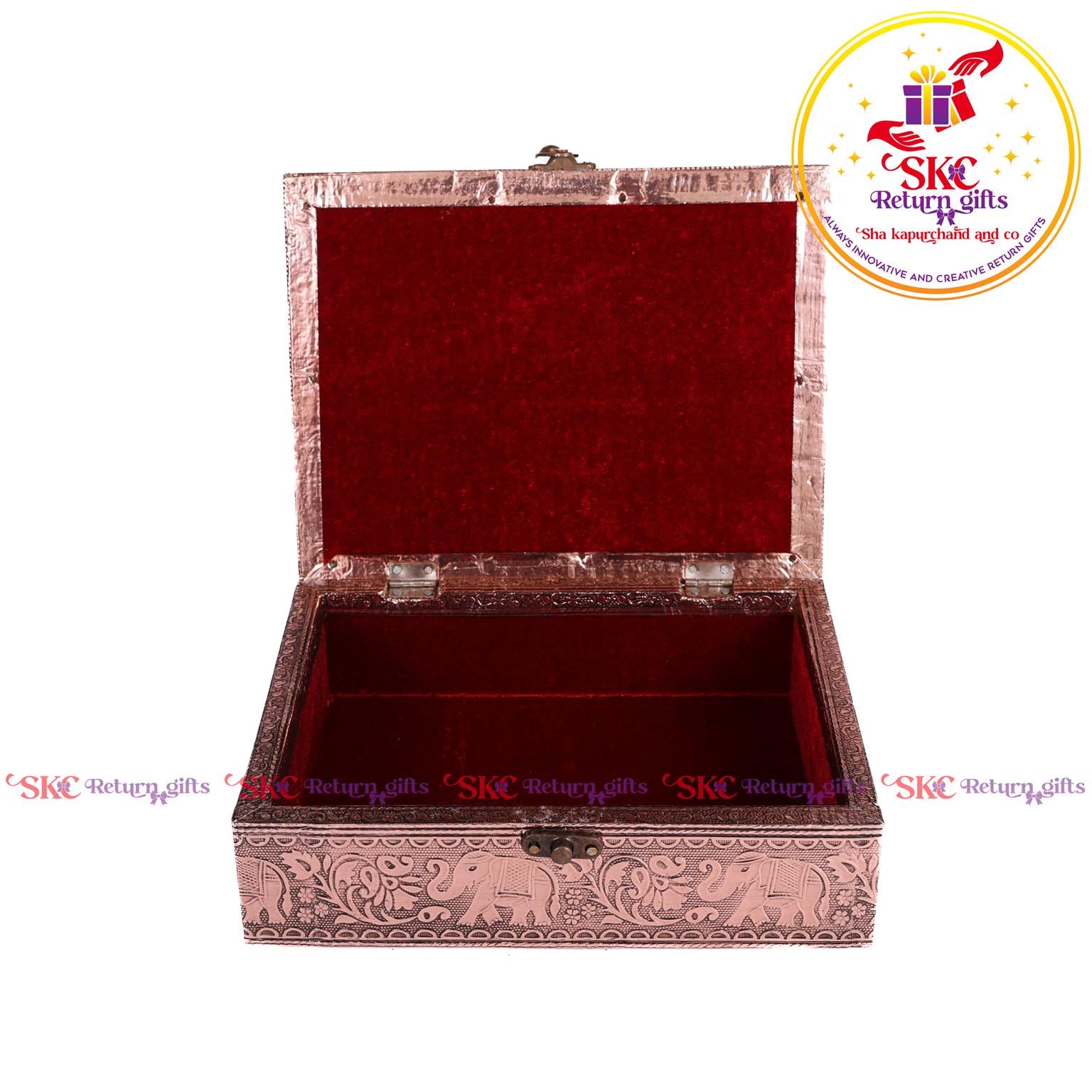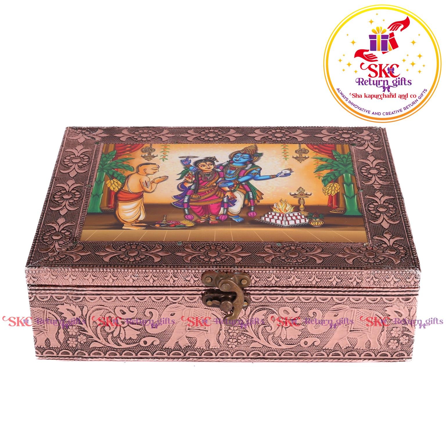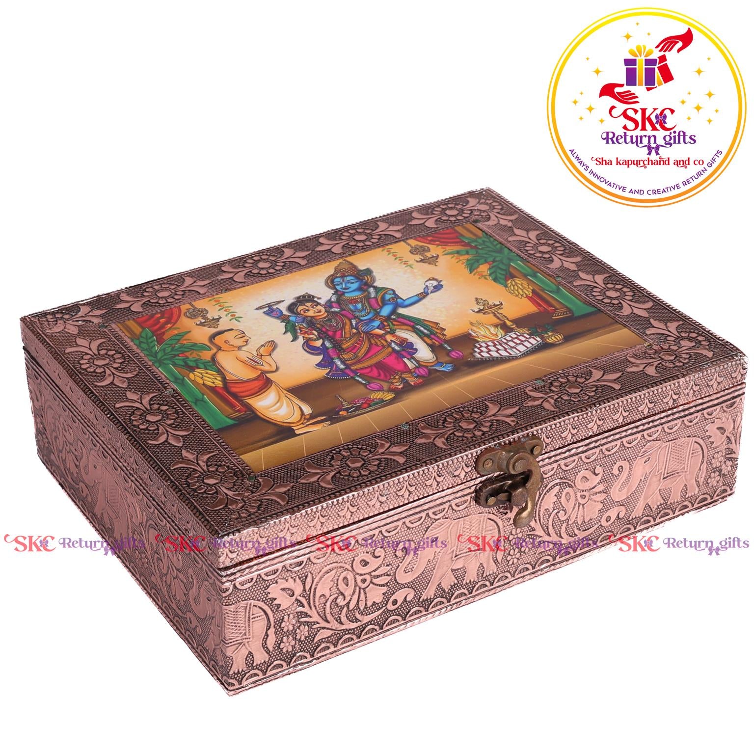 Elevate your return gifts with our exquisite collection of pooja and jewel boxes, designed to be both functional and enchanting. Crafted with intricate detailing and inspired by traditional artistry, these boxes are perfect for storing. Pooja items i, jewelry, or cherished treasures. A blend of cultural heritage and modern elegance, . Delight your guests with a gift that symbolizes both utility and timeless beauty.