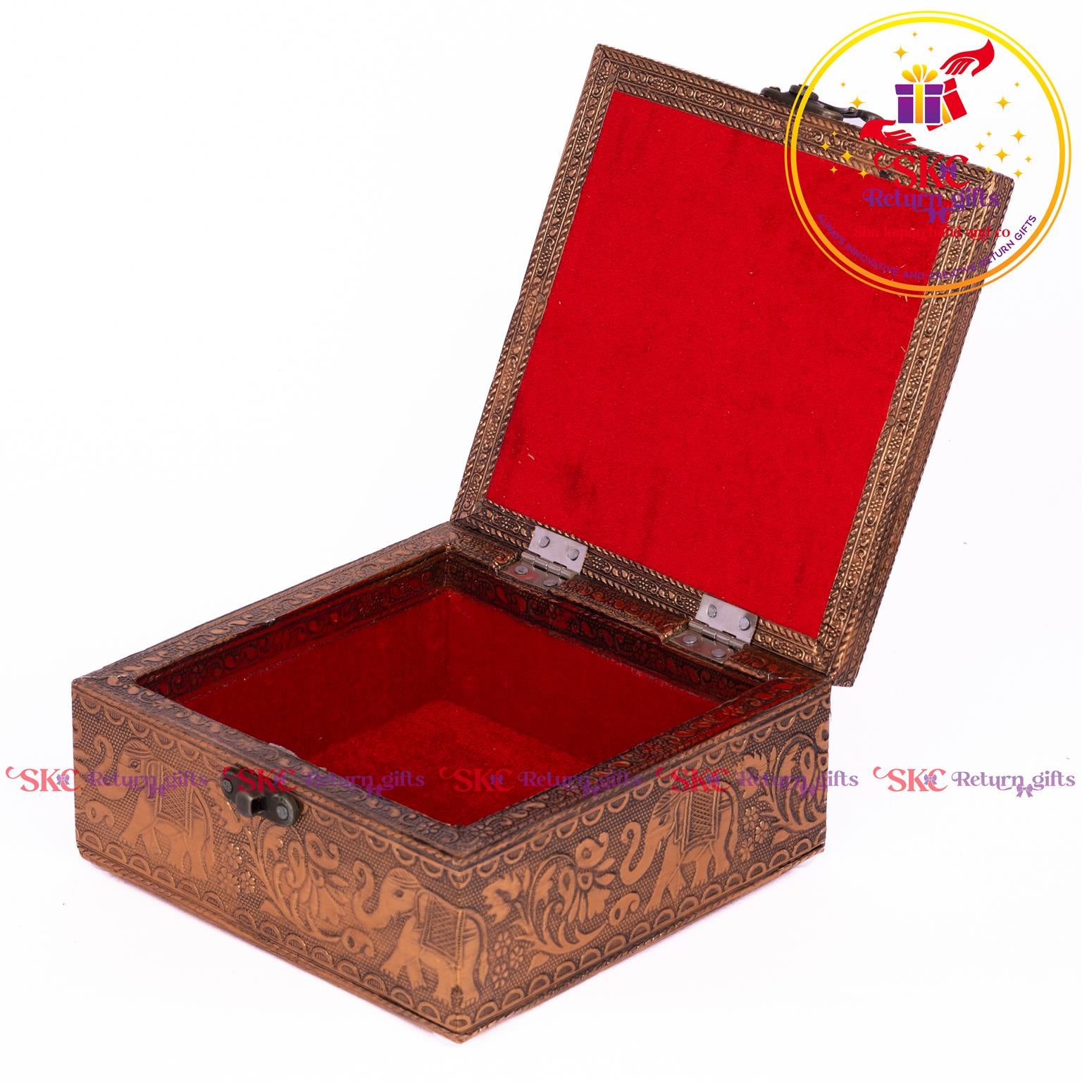 Elevate your return gifts with our exquisite collection of pooja and jewel boxes, designed to be both functional and enchanting. Crafted with intricate detailing and inspired by traditional artistry, these boxes are perfect for storing. Pooja items i, jewelry, or cherished treasures. A blend of cultural heritage and modern elegance, . Delight your guests with a gift that symbolizes both utility and timeless beauty.