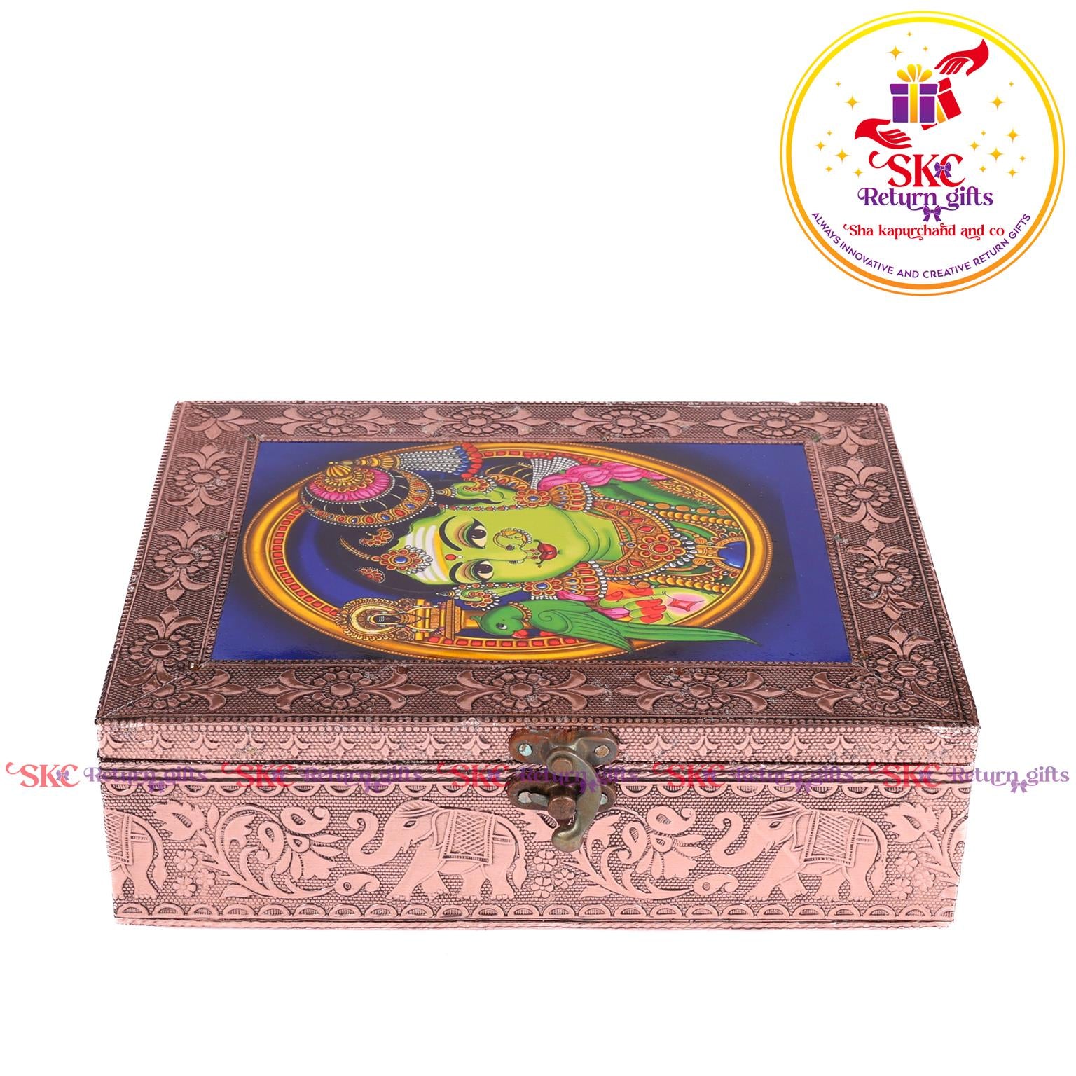 Elevate your return gifts with our exquisite collection of pooja and jewel boxes, designed to be both functional and enchanting. Crafted with intricate detailing and inspired by traditional artistry, these boxes are perfect for storing. Pooja items i, jewelry, or cherished treasures. A blend of cultural heritage and modern elegance, . Delight your guests with a gift that symbolizes both utility and timeless beauty.