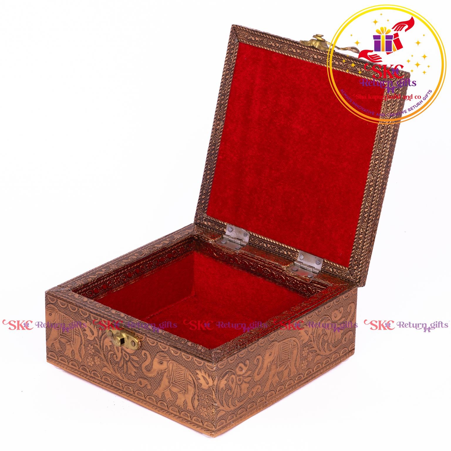 Elevate your return gifts with our exquisite collection of pooja and jewel boxes, designed to be both functional and enchanting. Crafted with intricate detailing and inspired by traditional artistry, these boxes are perfect for storing. Pooja items i, jewelry, or cherished treasures. A blend of cultural heritage and modern elegance, . Delight your guests with a gift that symbolizes both utility and timeless beauty.