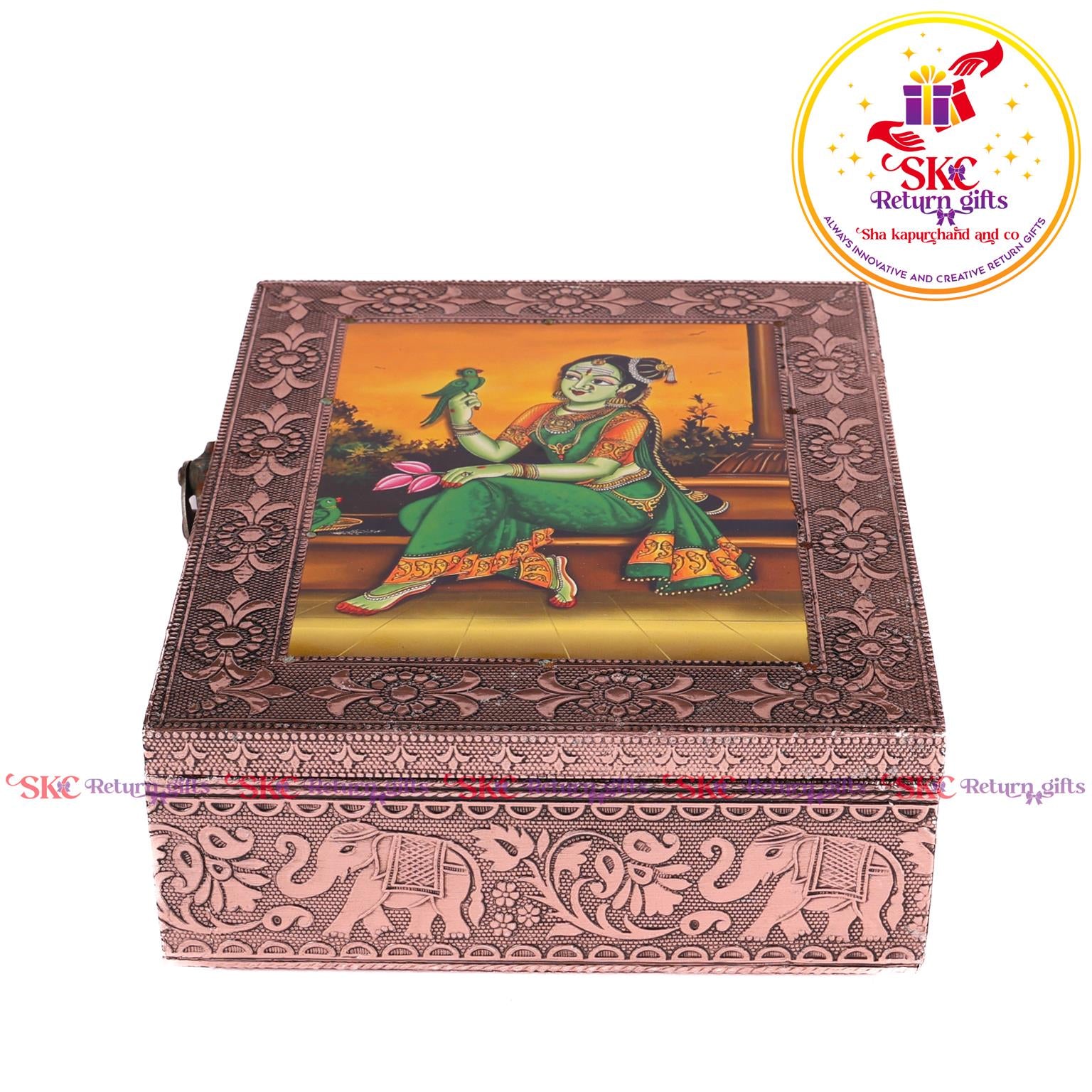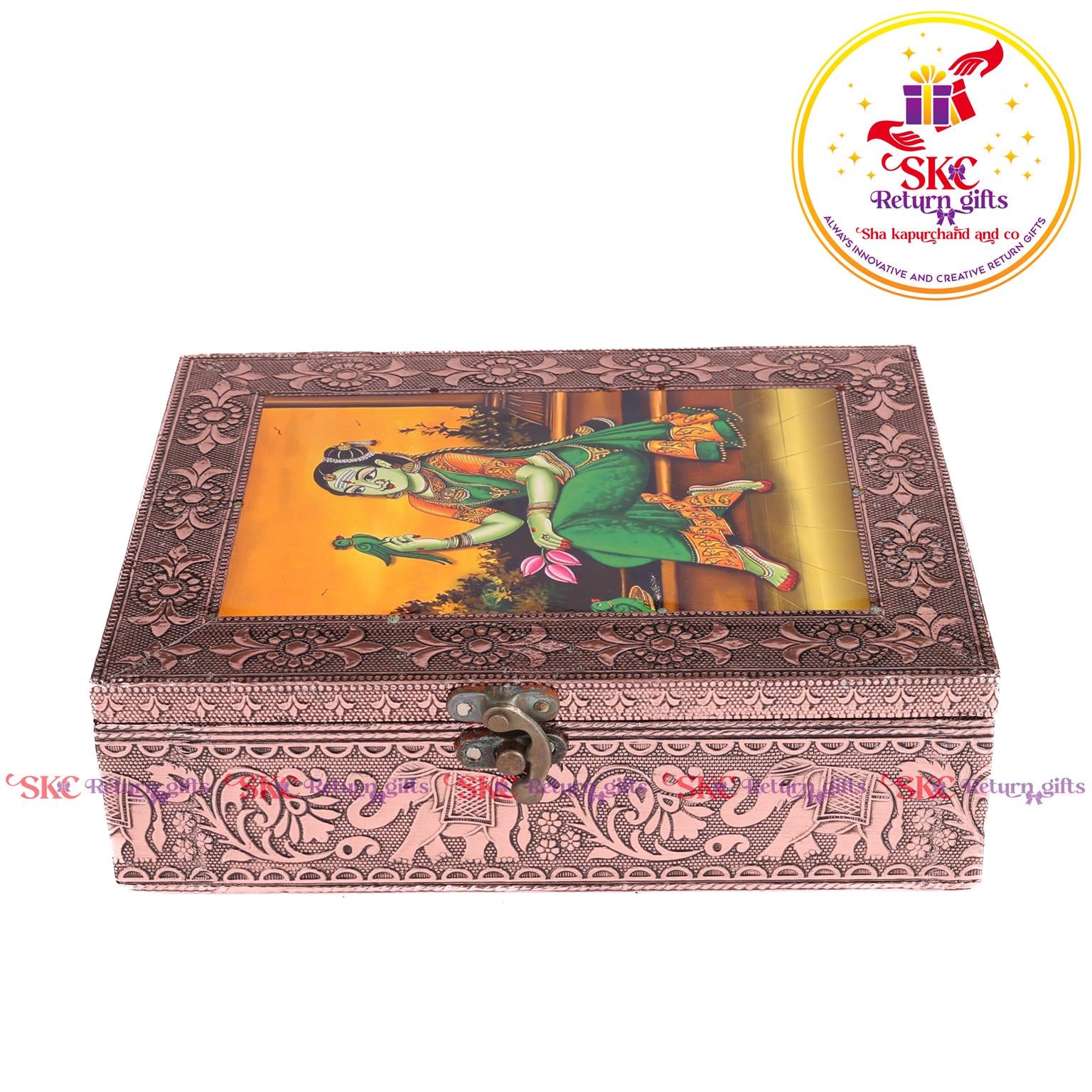 Elevate your return gifts with our exquisite collection of pooja and jewel boxes, designed to be both functional and enchanting. Crafted with intricate detailing and inspired by traditional artistry, these boxes are perfect for storing. Pooja items i, jewelry, or cherished treasures. A blend of cultural heritage and modern elegance, . Delight your guests with a gift that symbolizes both utility and timeless beauty.